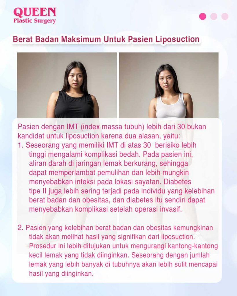 Pasien dengan IMT (index massa tubuh) lebih dari 30 bukan kandidat untuk liposuction karena dua alasan, yaitu: