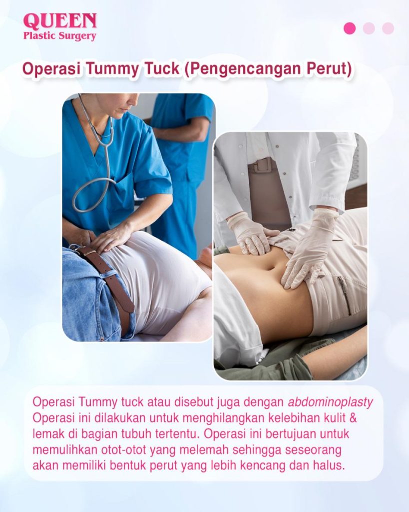 Operasi tummy tuck atau disebut juga dengan abdominoplasty. Operasi ini dilakukan untuk menghilangkan kelebihan kulit dan lemak di bagian tubuh tertentu. Operasi ini bertujuan untuk memulihkan otot-otot yang melemah sehingga seseorang akan memiliki bentuk perut yang lebih kencang dan halus.