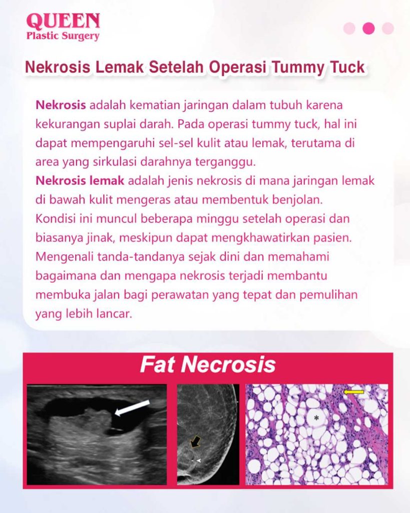 Nekrosis adalah kematian jaringan dalam tubuh karena kekurangan suplai darah. Pada operasi tummy tuck, hal ini dapat mempengaruhi sel-sel kulit atau lemak, terutama di area yang sirkulasi darahnya terganggu.