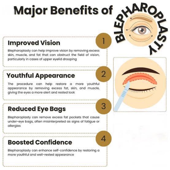 1. Meningkatkan Pandangan: Kulit kelopak mata atas yang berlebih dapat menghalangi  pandangan atas , sehingga sulit melihat ke atas saat mengemudi, meraih barang di rak tinggi, atau bahkan merias wajah. Blepharoplasty menghilangkan gangguan ini, sehingga seseorang mendapatkan pandangan yang lebih luas dan tidak terhalang sehingga dapat meningkatkan aktivitas seseorang.