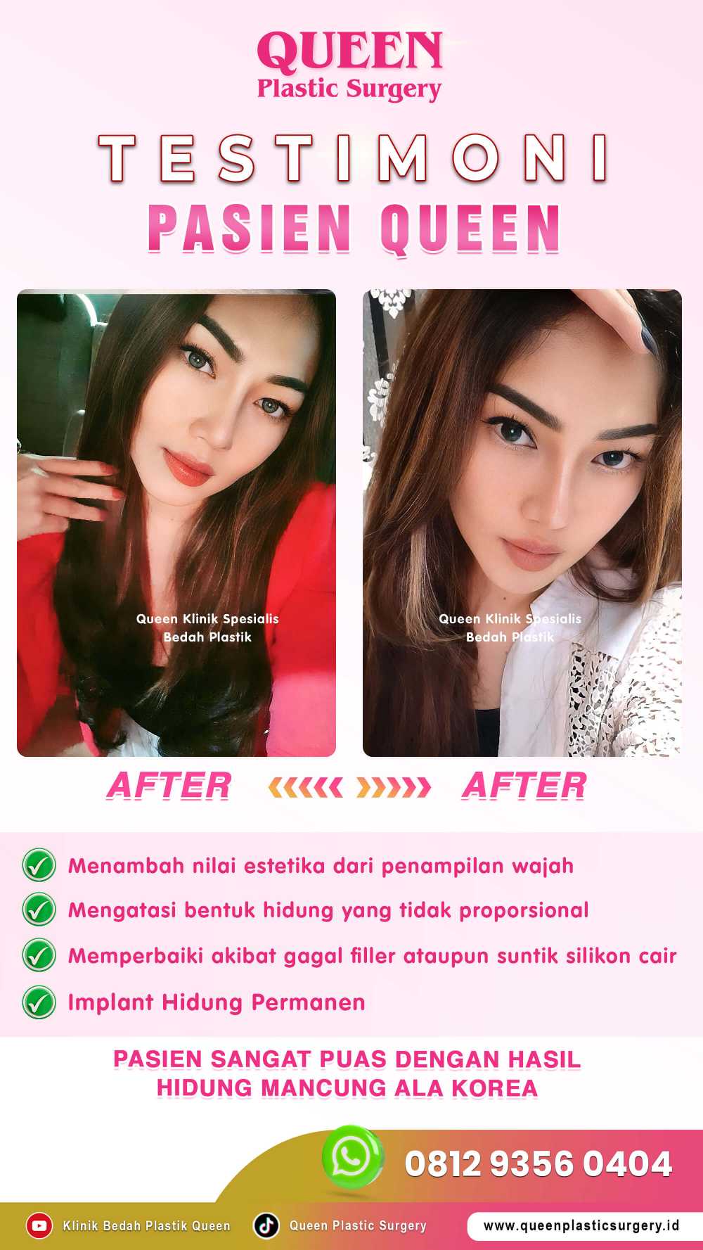 Tunggu apalagi Queeners, karena untuk operasi hidung mancung Klinik Kecantikan Queen Plastic Surgery ahlinya. Sudah ribuan review terkait kepuasaan yang dirasakan Queeners yang pernah melakukan operasi di Klinik Kecantikan Queen Plastic Surgery. Jadi tidak perlu ragu lagi akan keahlian dari dokter bedah plastik yang Klinik Kecantikan Queen Plastic Surgery miliki. Queeners hanya perlu datang atau menghubungi Klinik Kecantikan Queen Plastic Surgery di nomor hotline dibawah ini.