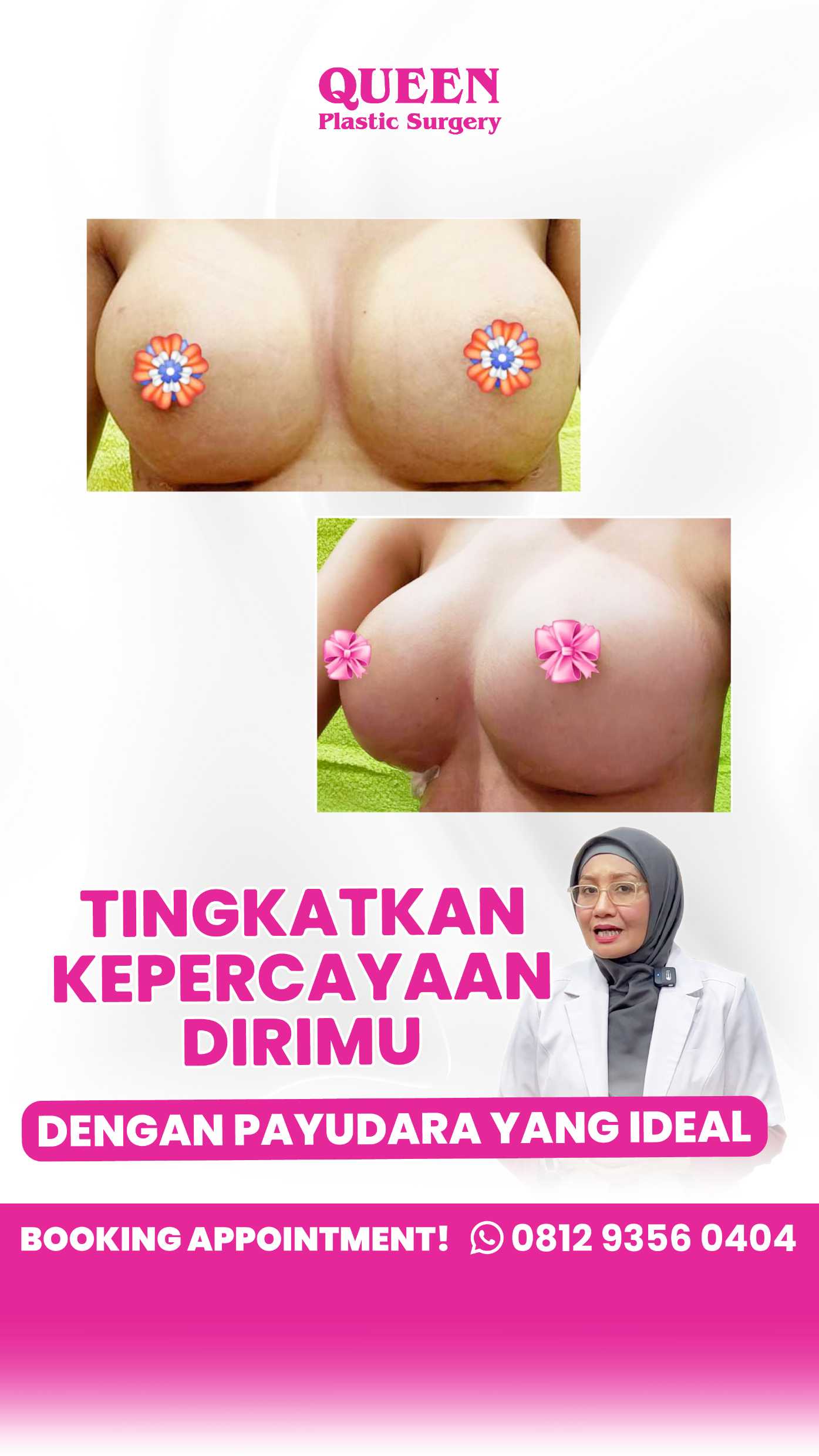 Salah satu indikator terbaik dari kualitas sebuah klinik adalah ulasan dari pasien-pasiennya. Queen Plastic Surgerydengan bangga menampilkan testimonial dan ulasan positif dari pasien yang telah merasakan manfaat dari perawatannya. LIHAT ULASAN ( https://maps.app.goo.gl/hDZctHZZu4rFkFQj8 )